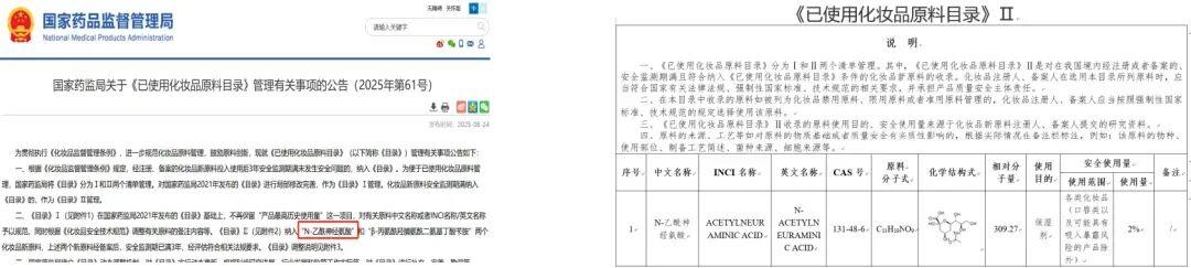 2025年6月24日,国家药监局公告“N-乙酰神经氨酸”已通过3年安全监测期作为首批新原料被纳入《已使用化妆品原料目录》Ⅱ中,和其他已在目录的原料一样,可免除多项毒理实验,降低品牌备案成本。
